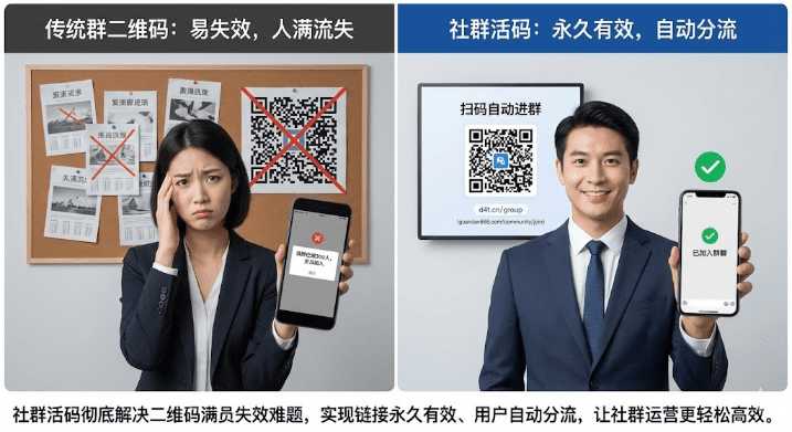 微信群满200人后二维码失效,用户无法扫码进群,手动拉人效率低下。做社群运营最头疼的莫过于群满后二维码失效,管理十几个群时每天光处理进群申请就要耗掉大半时间。更糟的是,你在朋友圈、公众号发的群二维码过几天就失效了,用户扫码看到"该群已满"直接流失。活码技术能让一个二维码永久有效,用户扫码自动分配到未满的群,彻底解放双手。