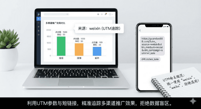 实操三步走:第一步确定要追踪的维度,包括utm_source(流量来源)、utm_medium(推广媒介)、utm_campaign(活动名称);第二步生成带参数的短链,在原始链接后添加参数再用短链工具缩短;第三步在数据后台查看分渠道效果,打开Google Analytics或百度统计,直接看到各渠道带来多少流量、转化多少订单。关键提醒:参数命名必须统一规范,微信统一用「weixin」,别一会儿「wechat」一会儿「wx」,否则数据会被拆散,分析时一团乱麻,建议做个团队命名文档。