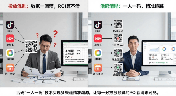 当你在抖音、小红书、朋友圈、线下活动同时投放,用的都是同一个企业微信二维码时,100个新客户加进来,根本分不清谁从哪来。抖音广告花了2万,线下活动花了5千,最后一起来了150个客户——到底哪个渠道划算?转化成本多少?数据全混在一起,只能凭感觉决策。