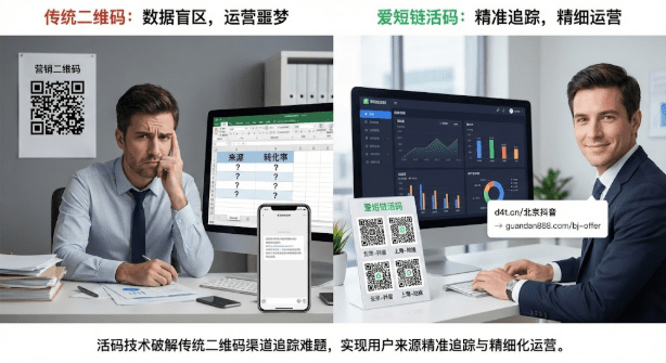 多渠道投放时用同一个二维码,导致无法区分用户来源,ROI计算成了糊涂账。月底复盘会上,老板盯着报表问:"这个月20万预算投了8个渠道,哪个ROI最高?"你只能拿出总扫码数和总转化数,说不清哪个渠道在烧钱,哪个是金矿。