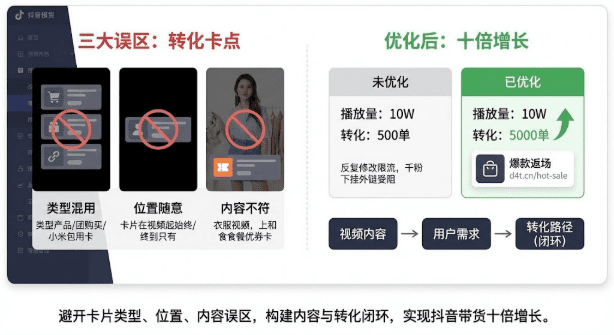 数据显示,同样10万播放量的视频,优化过卡片策略的创作者带货能达到5000单,而未优化的可能只有500单,转化率相差10倍。更关键的是,很多创作者发布后反复修改卡片,导致抖音算法认为内容不稳定直接限流。还有新手粉丝不到1000就想挂外链,却不知道平台有明确门槛限制。这些问题的根源在于:卡片不是挂上去就完事,而是要和视频内容、用户需求、转化路径形成闭环。