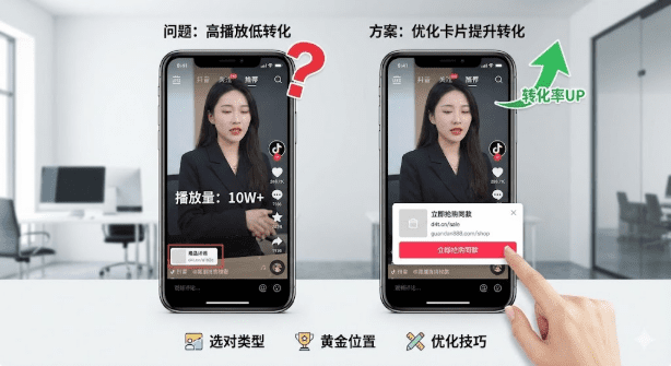 视频播放量不错但转化率低?90%的抖音创作者都卡在卡片功能上。选错卡片类型,再多流量也白费;位置放错了,点击率直接腰斩。本文详解3种抖音卡片类型的适用场景、黄金挂载位置,以及立即可用的优化技巧,帮你把视频流量真正转化成订单。