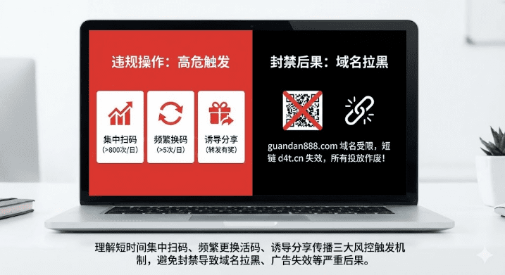 封禁后果呈阶梯式:轻则二维码无法扫描,重则账号被限制使用,最严重的是域名被永久拉黑——所有历史投放的广告、文章里的活码全部作废,损失难以估量。