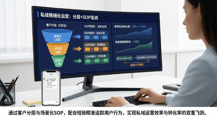 私域客户越来越多,转化率却上不去?问题出在把所有客户当成一类人运营。本文拆解客户分层+SOP的实战打法:通过3步分层法明确「对谁做」,用3类场景SOP解决「做什么」,配合短链工具追踪行为数据,让每个客户都被精准触达。某教育机构用这套方法,试听转化率从15%涨到42%,美妆品牌复购率提升58%。