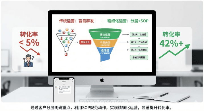 别想着一次性搞定所有客户层级。先选1-2个层级(比如新客户+沉睡客户)试运行SOP,跑通流程验证效果后再全面推广。记得在SCRM里设置数据回流机制,确保客户行为实时同步,分层才准确。3个月后你会发现:销售不用天天手动发消息,转化率却比以前高一倍。实际应用中,这套组合能让客户转化率提升30%以上,销售人效翻倍。