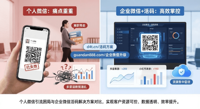 加粉二维码过期、员工离职带走客户、多渠道引流数据混乱——这些问题每天都在消耗引流成本。个人微信做私域引流存在三大致命缺陷:每天主动加人超30个就触发限制,换台手机登录直接风控预警;员工离职把客户全带走,连聊天记录都拿不回来;多个渠道投放用同一个码,根本分不清哪个渠道有效。本文详解企业微信+活码如何解决私域引流痛点,帮助企业实现客户资源可控、渠道数据可追踪、引流效率可提升。