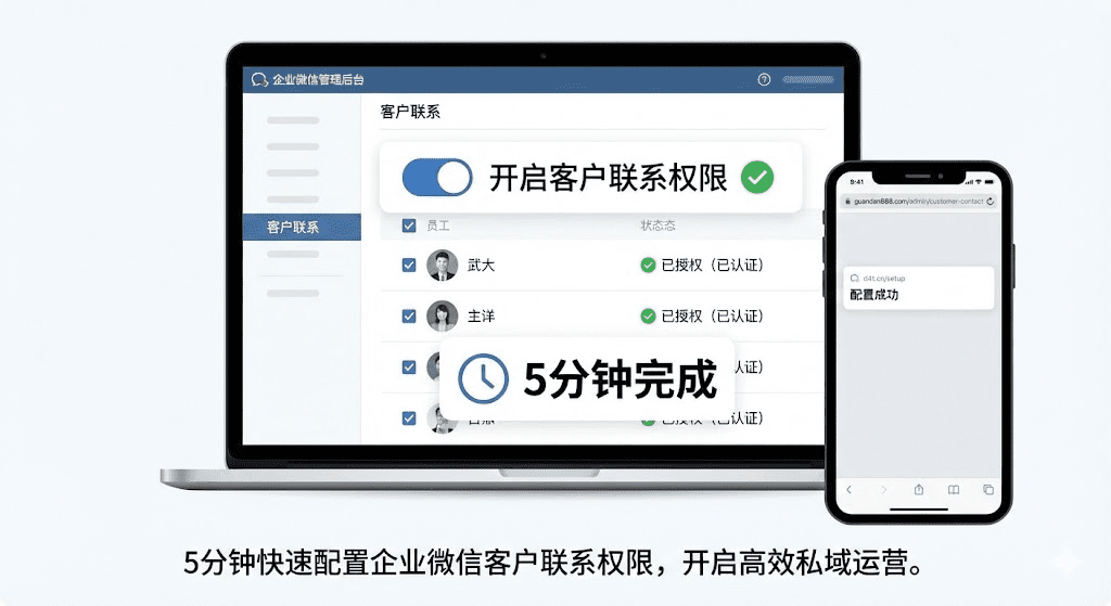 第一步是配置企业微信基础功能,仅需5分钟。登录企业微信管理后台,进入【客户联系】功能,开启"客户联系"权限,为客服人员开通授权。注意参与接待的员工必须完成企业微信认证,否则无法使用客户联系功能。