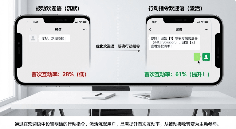 在欢迎语中设置明确的行动指令效果最好。某电商品牌在欢迎语中加了「回复1领取专属优惠券」,首次互动率从28%直接提升到61%。关键是让用户「动起来」,而不是被动接收信息。另一个电商品牌发现,添加成功后有72%的用户不说话。团队在欢迎语中增加互动指令「回复1领券,回复2看爆款」,首次互动率从28%跃升至61%,后续转化率也随之提升。