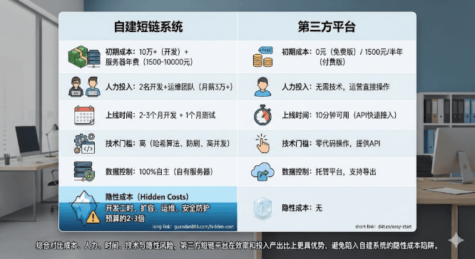 隐性成本的真实账单:"晨光烘焙"计划自建短链系统,招聘2名开发(月薪合计3万)加1名UI设计师(1.5万),3个月开发周期直接人力成本达13.5万元。而采用第三方服务,同样功能只需半年3500元,节省超过90%。这还没算后续的运维、扩容、安全防护等持续投入。