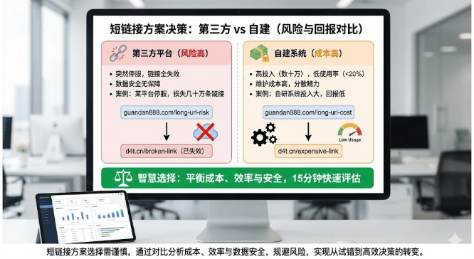 短链接方案选错代价不小:第三方平台突然停服,几十万条链接瞬间失效;自建系统投入几十万,使用率却不到20%。本文通过对比表加真实案例,帮运营负责人在成本、效率、数据安全间找到平衡点,15分钟判断该自建还是用第三方,避免踩坑浪费预算。