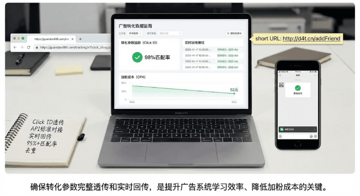 完成回传配置后,必须立即测试数据匹配率是否达到95%以上、用测试账号验证3秒内能否在后台看到转化数据、确认同一用户重复添加时后台只记录1次转化。某教育行业客户在优化回传配置后,加粉成本直接从85元降到52元,降幅超过38%。