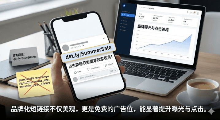 品牌曝光机会也在流失。别人用d4t.ly/xxx这样的品牌化链接,你用一串随机字符,用户转发时链接本身就是免费广告位,但你的链接毫无辨识度,白白浪费每次传播机会。特别是KOL合作场景,自定义域名能显著提升品牌记忆度。短链接工具就是解决这三个问题的——把链接压缩到10个字符以内,自动记录每次点击的时间、地域、设备,还能自定义域名打造专属品牌链接。