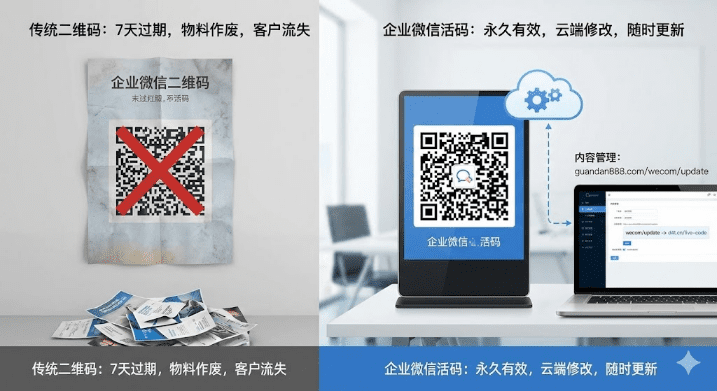 生成后内容就彻底固定了。企业微信群满200人?码直接废掉。员工离职?码跟着失效。活动结束了?扫码还是旧内容。想修改?只能重新生成、重新印刷、重新分发,整个流程再走一遍。物料刚印好就得重新换码,推广链接隔几天就失效,客户流失不说,人力和印刷成本也跟着打水漂。