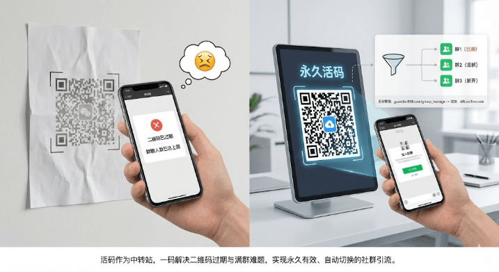 群二维码7天就过期,每周都要换码发链接;群满200人后无法扫码进群,只能手动拉人;管理10个群,光换二维码就要折腾半天。这些重复劳动每天都在消耗时间和精力。
