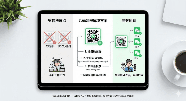 微信群二维码7天过期、满200人无法扫码进群,让社群运营陷入重复劳动。本文详解活码建群完整流程:从准备微信群、生成永久活码到多渠道投放,3步实现满群自动切换,彻底解放双手。附电商和知识付费实战案例,帮你快速掌握这项社群运营必备技能。