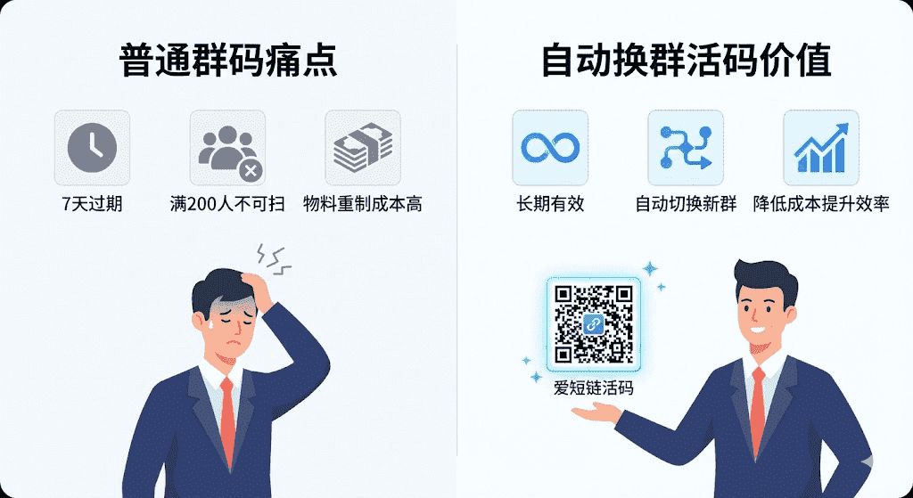 • 无论群码失效还是群满员,都必须重新制作海报、替换投放素材,不仅额外增加运营成本,物料更换的空窗期还会流失大量客源,算下来整体获客成本至少上浮30%。