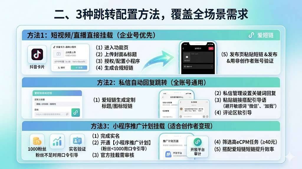 账号完成实名认证且粉丝≥1000,可开通抖音【小程序推广计划】,筛选高eCPM(≥40元)的互动类、短剧类任务; 官方挂载需在开放平台提交审核,粉丝不足1000可用口令引导跳转,搭配爱短链短链能进一步提升用户跳转效率。