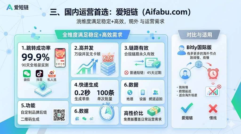 对比Bitly国际版,其国内访问依赖海外节点,跳转慢、数据延迟,更适合海外场景,而爱短链完全适配国内运营的实际需求。