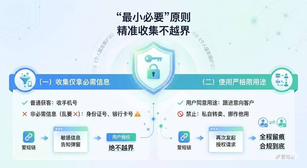 “最小必要”是《个人信息保护法》的核心铁则,爱短链从收集到使用帮你严格落地: