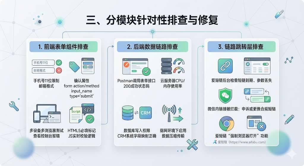 排查时务必模拟微信浏览器、移动端等真实用户场景,别忽略第三方平台拦截的可能性。 日常通过爱短链(https://www.aifabu.com)的巡检与预警功能,可大幅降低留资故障的发生概率,守住每一条来之不易的线索!