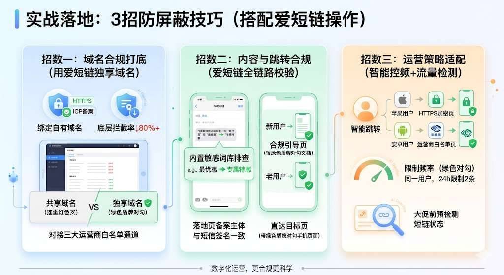 核心避坑3要点: ①绝对不用共享/无备案域名,绑定爱短链自有合规域名是基础; ②落地页清敏感词,分层跳转+提前合规报备; ③每周用爱短链自查,数据异常立刻调整。 立即前往「爱短链」官网(https://www.aifabu.com),解锁专业短链防屏蔽能力,让你的营销短信不再石沉大海!
