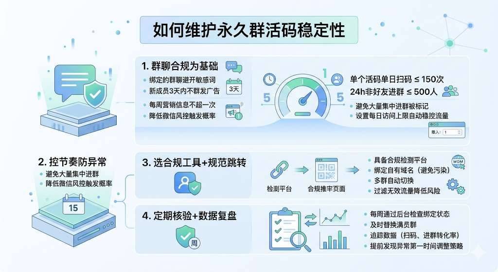 群聊合规是永久群活码稳定的根基! 绑定的群聊要避开敏感词,新成员三天内不群发广告,每周营销信息不超一次,从源头降低微信风控触发概率,别让违规群连累活码。