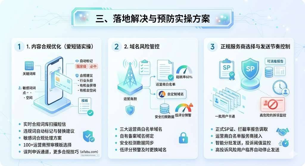使用爱短链内置的实时合规词库一键扫描短信,自动标记“国家级”“必中”等违规词,还能给出“行业头部”“有机会获得”这类合规替换建议。 对无法替换的敏感词,系统会生成打点、空格间隔等合规处理方案,另有一百余种运营商预审的合规模板可供选择。 若遇误判,可通过爱短链客服通道提交材料申诉,也可登录爱短链官网https://www.aifabu.com查看更多合规技巧。