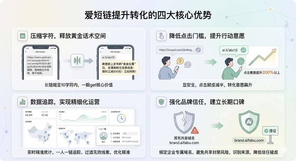 做短信营销总踩长链占字数、用户不愿点、效果无追踪的坑?用爱短链(https://www.aifabu.com)优化链路,从话术空间、点击意愿、数据运营、品牌信任四大维度破局,让短信转化率翻3倍!