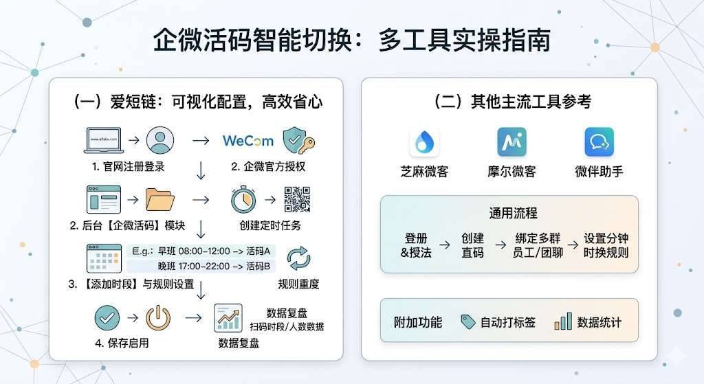 企微原生功能不支持按时间自动切换,需借助第三方授权工具,优先推荐爱短链: