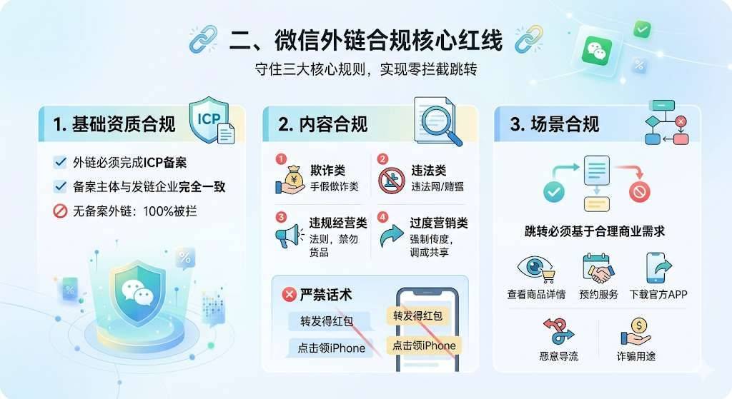 微信限制外链绝非故意卡脖子,而是基于《腾讯微信软件许可及服务协议》《微信个人账号使用规范》,从三个核心维度筑牢生态安全墙: