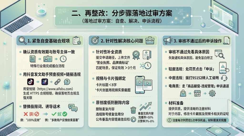 审核不通过先看具体原因,别盲目整改:资质问题补全清晰标注的材料,内容违规提供修改后的卡片截图、视频与卡片强关联的证明; 轻度违规直接在处罚页点击「申诉」,中度违规拨打95152转人工说明情况,电商类走「商品橱窗-违规管理」申诉通道; 注意每次判罚仅1次申诉机会,材料需真实完整。