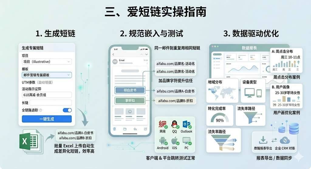 同一邮件内别重复用相同短链,给不同CTA按钮、内容模块生成专属短链,既能精准追踪用户兴趣,还能避开反垃圾邮件系统的重复链接检测; 短链后缀加个品牌字符(如aifabu.com/品牌名-活动名),进一步提升用户信任; 嵌入后务必在网易、QQ、Outlook等主流客户端,以及安卓、iOS、PC端测试跳转,确保所有场景下都能正常打开。
