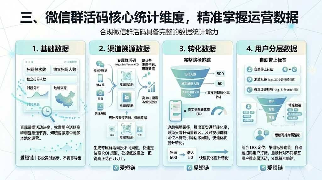 合规的微信群活码具备完整的数据统计能力,核心维度包括以下四项: