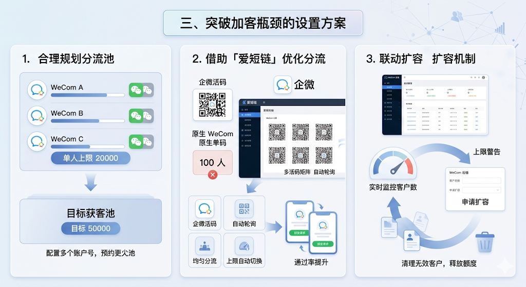 3. 联动扩容机制:实时监控客户数,临近上限提前申请扩容;同时定期清理无效客户,释放额度。