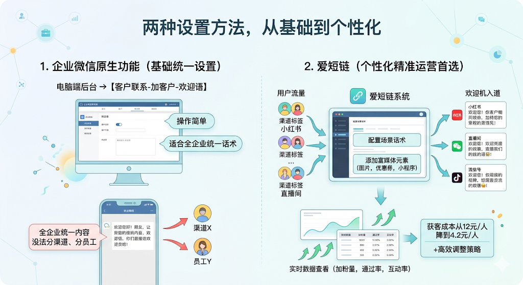 作为企微客户运营,你是不是常遭遇加好友后触达不及时、手动发欢迎语漏发又低效的难题? 别愁!本文结合爱短链(https://www.aifabu.com),从核心价值、设置方法到优化技巧,带你快速掌握企微活码自动欢迎语玩法,搞定私域首转化!