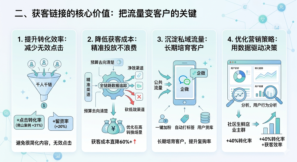 中小微企业运营负责人是不是总发愁发了无数链接,流量来了又走,留不下半条线索?普通链接只是“跳转工具”,获客链接却像自带“营销大脑”,能把路过的流量转化为可跟进的客户。今天就把两者的核心差异、获客价值、适用场景掰明白,帮你用对链接,把流量真正变成客户!