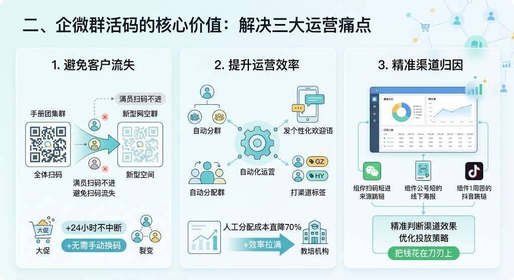 普通企微群码是彻头彻尾的“死码”——单个外部群仅支持200人扫码,满员直接失效,你得重新生成新码、替换全渠道物料,折腾半天还容易漏改。
