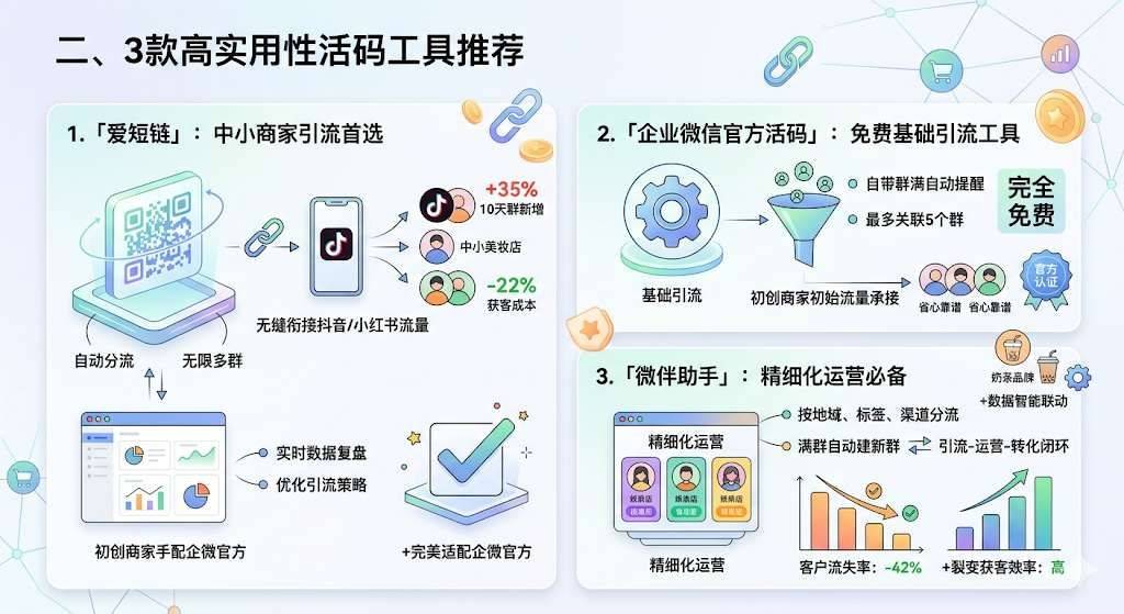 优先选择企微官方认证工具,规避账号违规风险;按需选型,中小商家别盲目追求全链路功能,聚焦核心需求即可;定期通过工具数据看板检查群状态,确保流量承接顺畅。 想要快速解决群满断流问题,立即体验爱短链:https://www.aifabu.com
