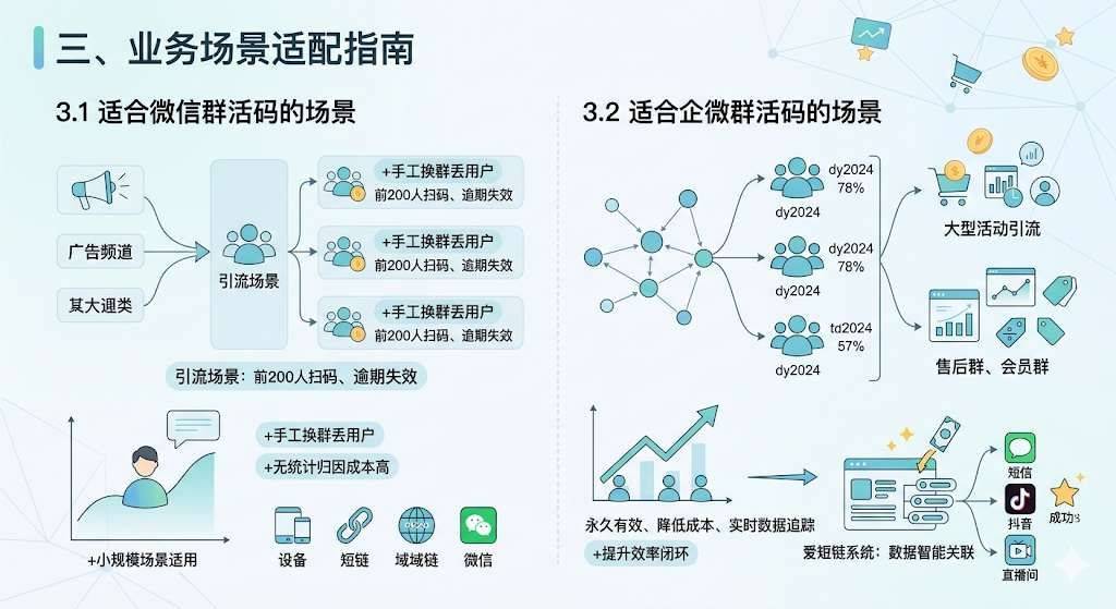 作为企业社群运营负责人,你是不是总被这些问题困扰:群码7天失效断引流、满群后手动建群丢流量、客户来源模糊难运营? 本文对比企微群活码与微信群活码核心差异,教你选对工具,用爱短链实现高效私域运营。